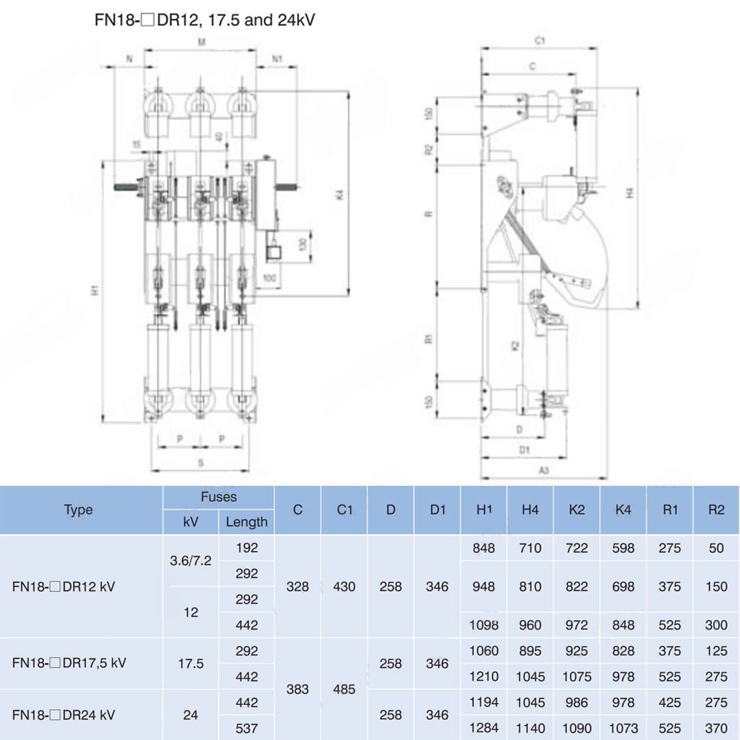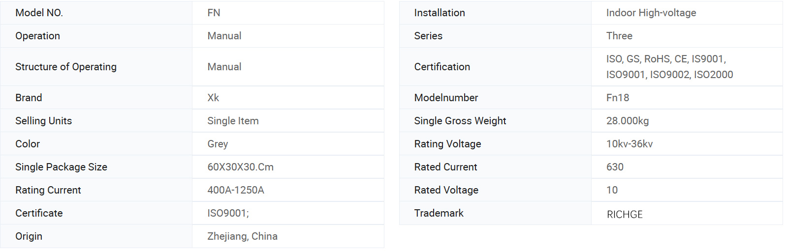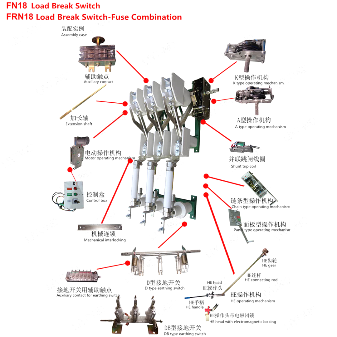 Los interruptores de carga FN18 y las combinaciones de fusiones de interruptor de carga son interruptores de carga de alto voltaje y alto rendimiento que combinan extinción de arco de aire comprimido y producido de arco producido por gas. La combinación de interruptor de carga y fusible combina las ventajas del interruptor de carga con las del fusible para cambiar cualquier corriente de carga hacia la corriente de ruptura nominal del interruptor de carga, y para cambiar cualquier sobrecorriente a la corriente de ruptura de cortocircuito con calificación de la combinación mediante la operación del fusible y su impinger.