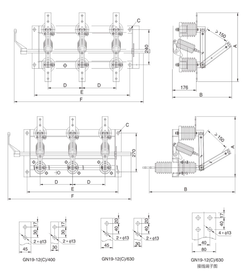 La parte conductora del interruptor de desconexión de tipo GN19-19-12/400, 630, 1000, 1250 se fija en la base por dos aisladores de pilares para cada fase. (El tipo GN19-12C/400, 630, 1000, 1250 tiene un aislante de pilar y un aislante de carcasa de porcelana). Las tres fases se instalan en paralelo, y la parte conductora consiste en contactos estáticos de cuchillos de contacto y titulares de contactos (o varillas conductoras). Cada fase del cuchillo de contacto está conectada al medio del aislante de unión, un aislante de unión e instalada en la base del huso conectado. El huso está conectado a la biela (proporcionada por el usuario) y el tipo de mecanismo de mudanza CS6-1 a través del mango. El cuchillo de contacto de conexión está compuesto por dos placas de cobre ranuradas, lo que no solo aumenta el área de disipación de calor del cuchillo de contacto para bajar la temperatura inferior, sino que también mejora la resistencia mecánica del cuchillo de contacto, de modo que se mejore la estabilidad dinámica del interruptor. Un extremo del cuchillo de contacto está montado en el bloque de contacto (o en la varilla conductora) por un perno (automóvil de Shaw). GN19-12/1000, 1250 en contacto con la instalación de placa de bloqueo magnético, Plus the ProfisE de la placa de bloqueo magnético es que cuando una gran corriente de cortocircuito para mejorar el cuchillo de contacto de dos ranuras entre el | atracción. GN19-12/400, 630 Los interruptores de desconexión tienen un límite pequeño a través de la corriente, por lo que no es necesario agregar una placa de bloqueo magnética.