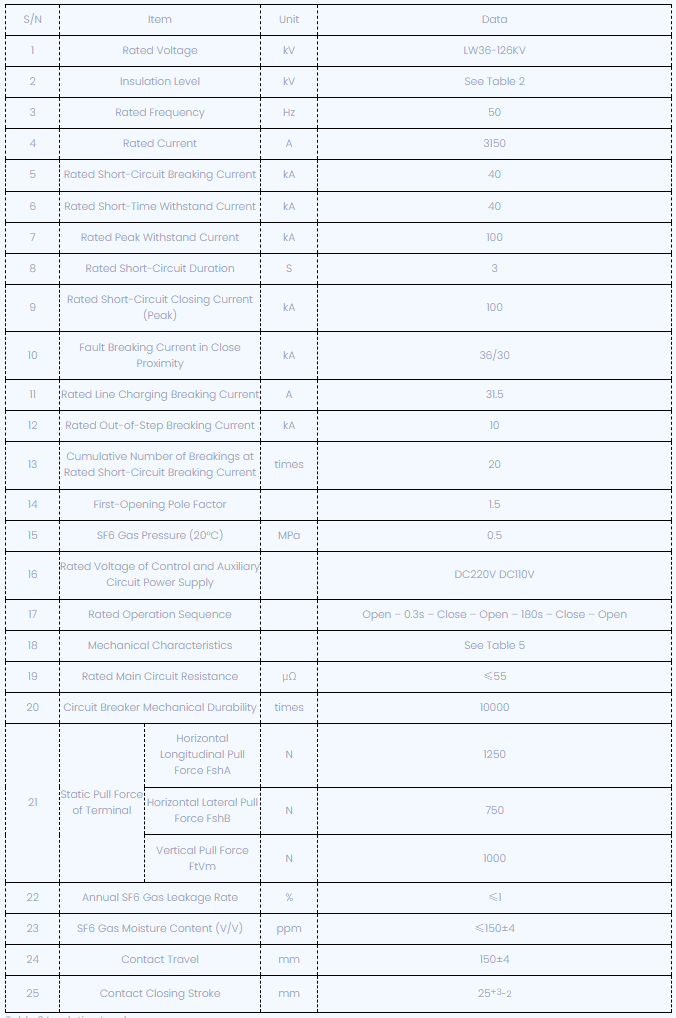 Parámetros técnicos del interruptor de circuito LW36-126 SF6