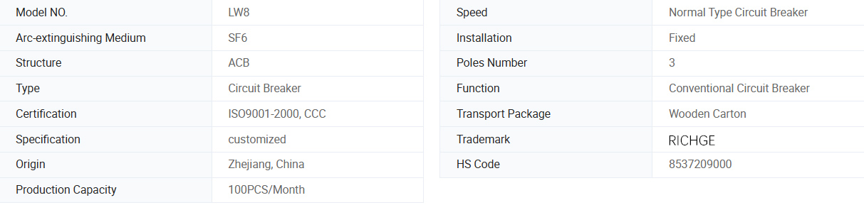 LW8-40.5, la serie LW8A-40.5 Los interruptores de circuito de hexafluoruro de azufre de LW8A-40.5 son equipos eléctricos de alto voltaje de AC 50Hz de AC 50Hz, adecuados para el control y protección de 40.5kV de transmisión y sistema de distribución, también se pueden utilizar para interruptores de circuitos de conexión y abiertos y bancos de capaces cerrados. El producto se puede usar con el mecanismo de resorte CT14. El interruptor de circuito se ajusta al estándar Nacional GB1984-interruptor de circuito de alto voltaje de CA de 1989 y al estándar de la Comisión Electrotécnica Internacional IEC56, IEC6220-100 Rompedor de circuito de CA de alto voltaje.