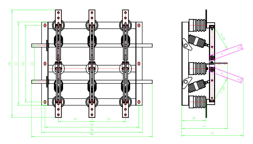 La parte conductora del seccionador tipo GN19-12/400, 630, 1000, 1250 se fija a la base mediante dos pilares aisladores para cada fase. (Los tipos GN19-12C/400, 630, 1000, 1250 tienen un aislador de pilar y un aislador de carcasa de porcelana). Las tres fases se instalan en paralelo y la parte conductora consta de contactos estáticos de cuchillas de contacto y soportes de contacto (o varillas conductoras). Cada fase de la cuchilla de contacto está conectada al medio del aislador de unión, al aislador de unión y se instala en la base del husillo conectado. El eje está conectado a la biela (proporcionada por el usuario) y al mecanismo de movimiento tipo CS6-1 a través del mango. La cuchilla de contacto de conexión se compone de dos placas de cobre ranuradas, lo que no solo aumenta el área de disipación de calor de la cuchilla de contacto para reducir la temperatura inferior, sino que también mejora la resistencia mecánica de la cuchilla de contacto, de modo que se mejora la estabilidad dinámica del interruptor. Un extremo de la cuchilla de contacto está montado en el bloque de contacto (o en la varilla conductora) mediante un perno (automóvil de Shaw). GN19-12/1000, 1250 en contacto con la instalación de la placa de bloqueo magnético, además el propósito de la placa de bloqueo magnético es que cuando una gran corriente de cortocircuito mejore la cuchilla de contacto de dos ranuras entre | atracción. Los interruptores de desconexión GN19-12/400, 630 tienen un pequeño límite de corriente, por lo que no es necesario agregar una placa de bloqueo magnético.